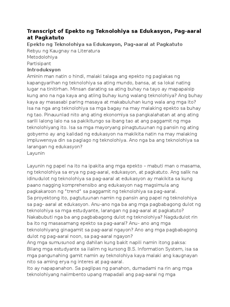 Written by Jay S. Paggamit ng Teknolohiya sa Edukasyon. View Transcript_of_Epekto_ng_Teknolohiya_sa_Edocx from INTERMEDIA 12 at University of Notre Dame.