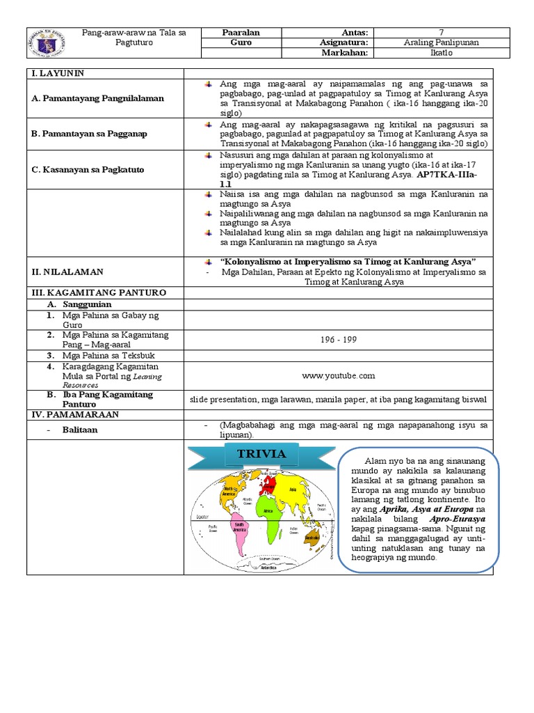 Lesson plan sa pagtuturo ng imperyalismoatkolonyalismo. DAILY LOG OF LESSON PLAN IN ARALING PANLIPUNAN 2 Unang. Ang presentasyon ay dapat madaling maibabagay sa mga pagbabago kung kapansin-pansin na naiinip o nalilito ang mga estudyante. Makilala at matukoy ang mga bumubuo sa pamahalaang pambansa at pamahalaang lokal na itinatag ng Espanyol.
