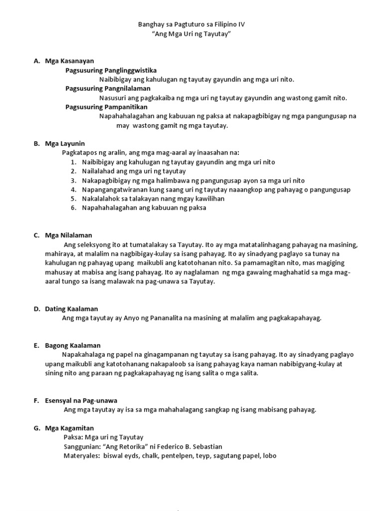 Banghay Ng Pagtuturo Sa Filipino Iv Ang Mga Uri Ng Tayutay Pdf