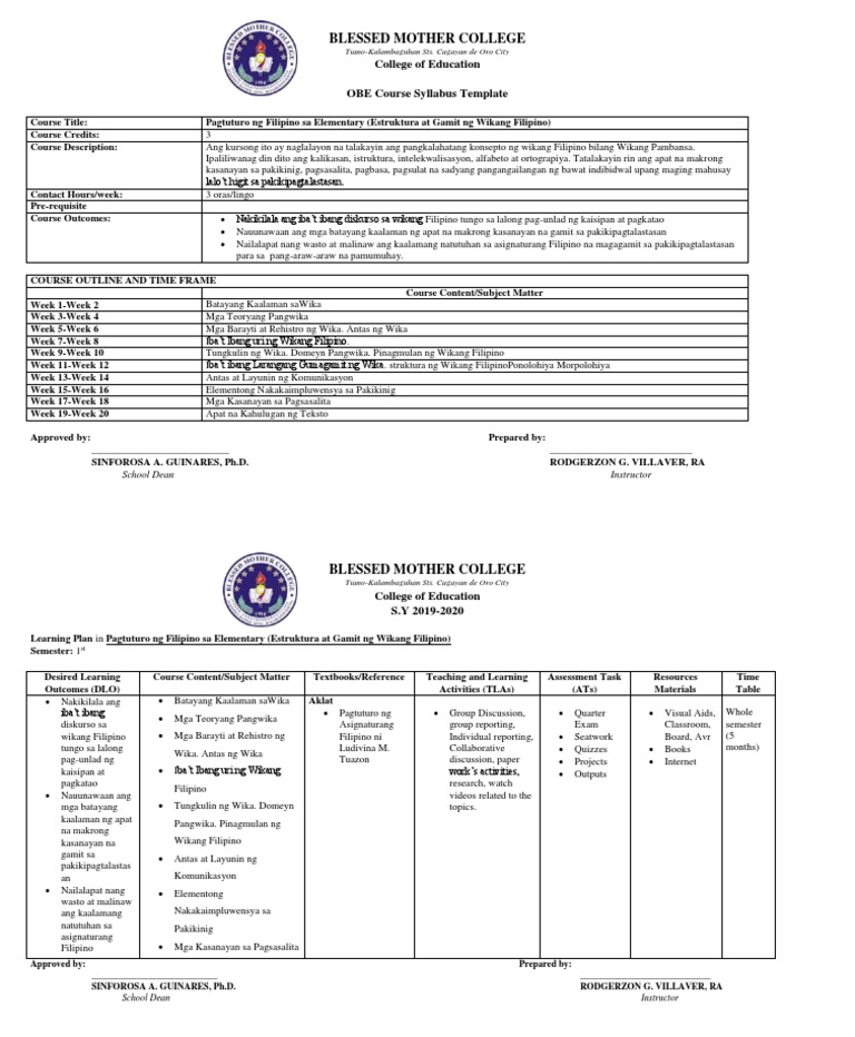 Pagtuturo ng Filipino sa Elementarya I Estruktura at Gamit sa Wikang Filipino Bilang ng Yunit. EED Fil b PAGTUTURO NG FILIPINO SA ELEMENTARYA Panitikan ng Pilipinas Course Unit 3 units 3 hoursweek Paggamit ng mga ibat ibang anyo ng Literatura ng Pilipinas galling sa sarili at ibat ibang rehiyon sa pagtuturo produksyon at assessment na angkop sa elementarya. Maaaring gawin ang pagpapahayag ng wika sa paraang pasulat o pasalita.