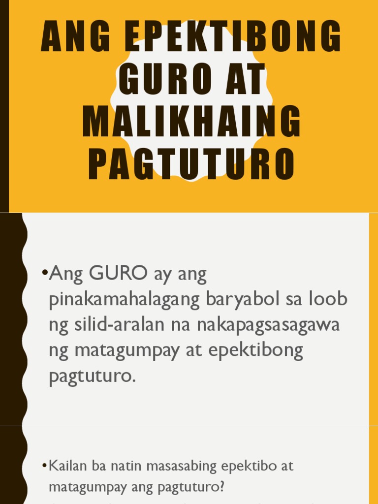 - Naghahanap ang guro ng paraan na maging kabilang. Mga Salik sa Epektibong Pamamaraan ng Pagtuturo sa Asignaturang Filipino sa Mataas na Paaralan ng Palompon Institute of Technology Palompon Leyte Isang Pananaliksik na Iniharap kay Gng. Dahil dito dapat alalahanin ng guro na maaari niyang matukoy.