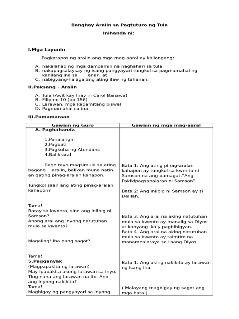 Ngayon ano ba ang napansin ninyo sa istruktura ng awiting Paubaya at sa Tulang Ang Kalupi Ng Puso ni. Masusing Banghay Aralin sa Araling Panlipunan 10 Unang Araw I. DETALYADONG BANGHAY ARALIN SA FILIPINO 1 I.