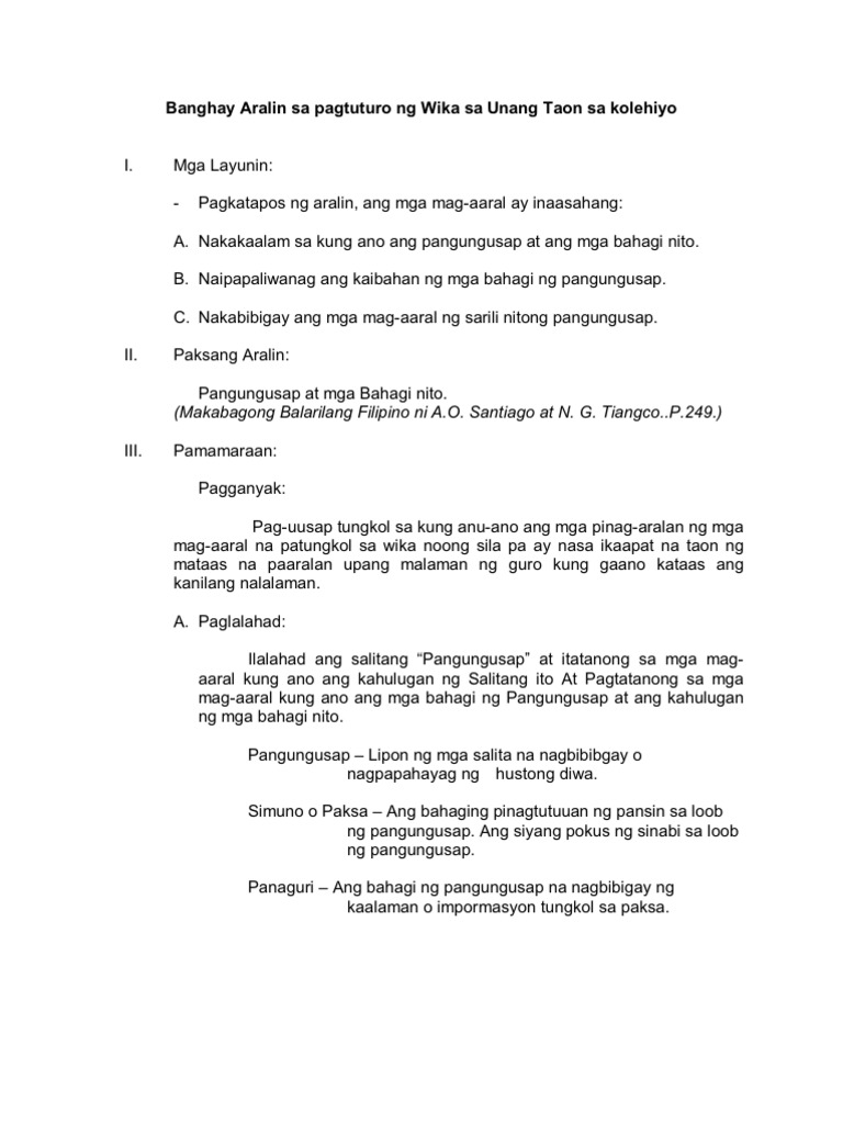 Banghay Aralin Sa Pagtuturo Ng Wika Ng Unang Taon Sa Kolehiyo Pdf