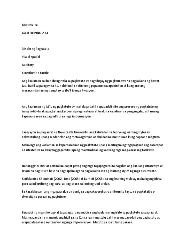 Upang matuto dapat malaman ng isa kung paano mag-aral at gawing panloob ang nakuhang kaalaman. Hindi namin sinusubukan na ilagay ang mga mag-aaral sa isang mahigpit na kahon ng istilo ng pag-aaral dito. Mga Natatanging Diskurso sa Wika at Panitikan Mga Istilo sa.