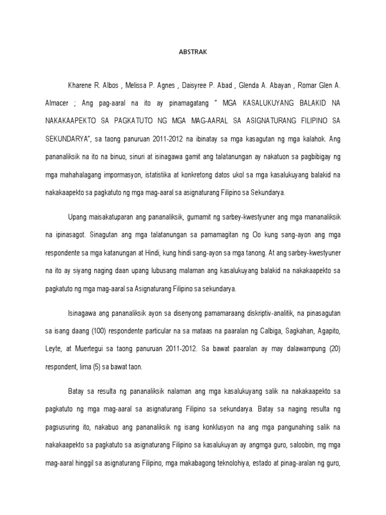 Tulad sa una naming itinalakay sa Filipino natutunan ko kung ano talaga ang sariling atin. ROSARIO Agdao Integrated School ABSTRAK Ang layunin ng pag-aaral na ito ay upang matukoy ang mga salik na nakakaapekto sa pagkatuto ng mga mag-aaral sa asignaturang Filipino. Gumamit ang mananaliksik ng talatanungan upang.