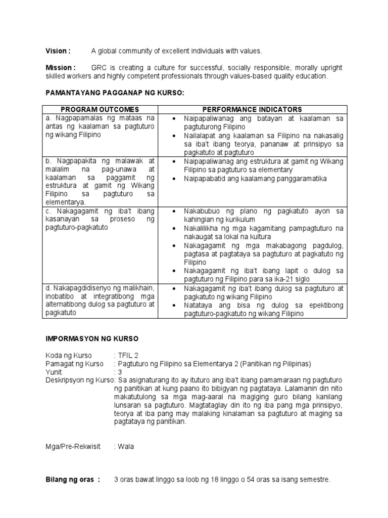 Pagtuturo Ng Filipino Sa Elementarya 1 Syllabus