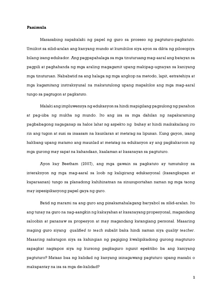Nakasalalay sa kamay ng isang guro ang kahihinatnan ng isang musmos at hubad pa kaalaman. Tunay na napakalaki ng responsibilidad at pananagutan ng isang guro kung kayat. Tungkulin ng Pamahalaan na bigyan ang tao.