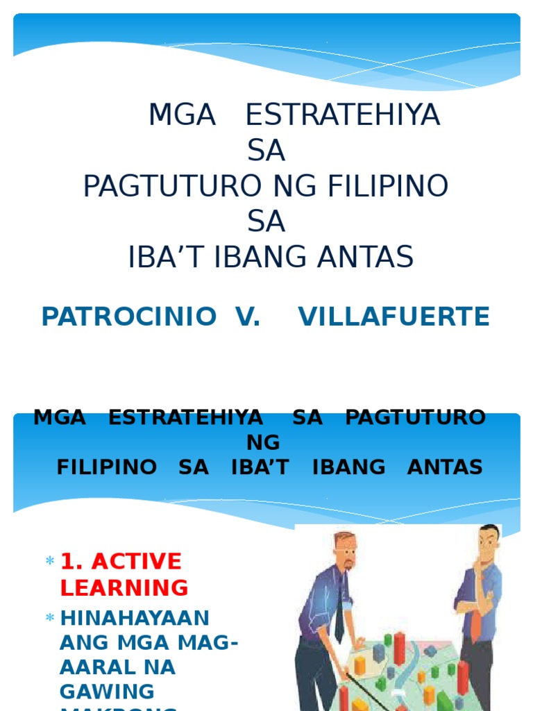 Mga istratehiya sa pagtuturo ng wikang filipino. Webster dictionary pamamaraan sa pagtuturo mga kagamitan atgawaing ginagamit sa bawat hakbang ng pagtuturo tulad ng gamit ng teksto at larong pangwika teknik sa pagtuturo refers to the art or skill of performance. Nakapaloob din dito ang pagkatutong nakatuon sa magaaral at ang integrasyon ng mga makrong kasanayan.